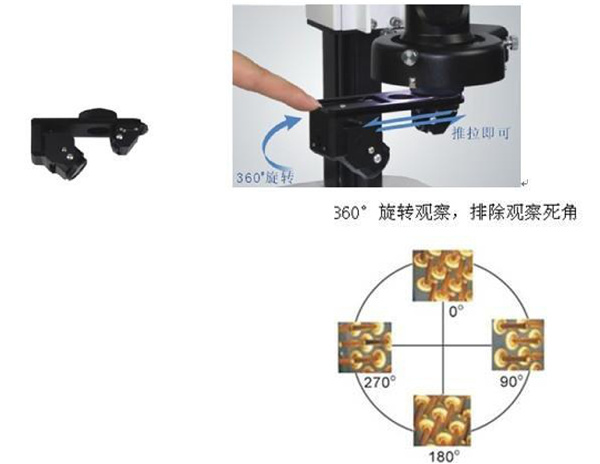 可手动切换 2D/3D 观察角度,采用 3D 镜头观测立体元件和深孔,切换时清晰度保持不变、中心位置一致。提供 360°旋转观察,观察工作距离达 95mm,此为目前业界最高水平。具有多种数字和模拟视频系统可满足各种用户的需求。